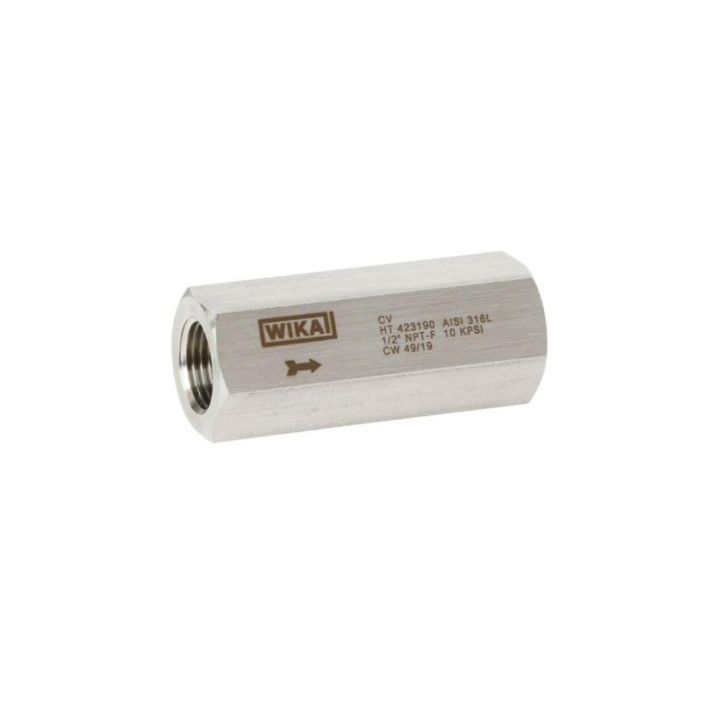 WIKA CV là dòng check valve thiết kế chắc chắn, đạt hệ số an toàn 4:1, dùng ngăn dòng chảy ngược trong hệ thống đo áp suất, thủy lực hoặc điều khiển khí nén. Van sử dụng cơ cấu piston tự căn tâm giúp tăng độ kín và tuổi thọ. Đóng kín kép gồm: